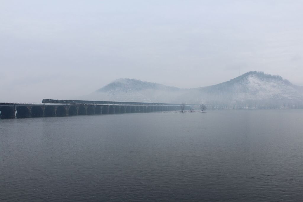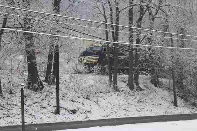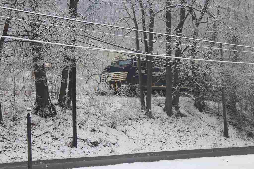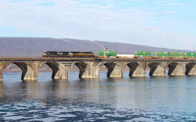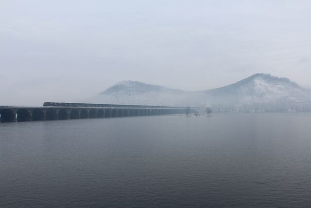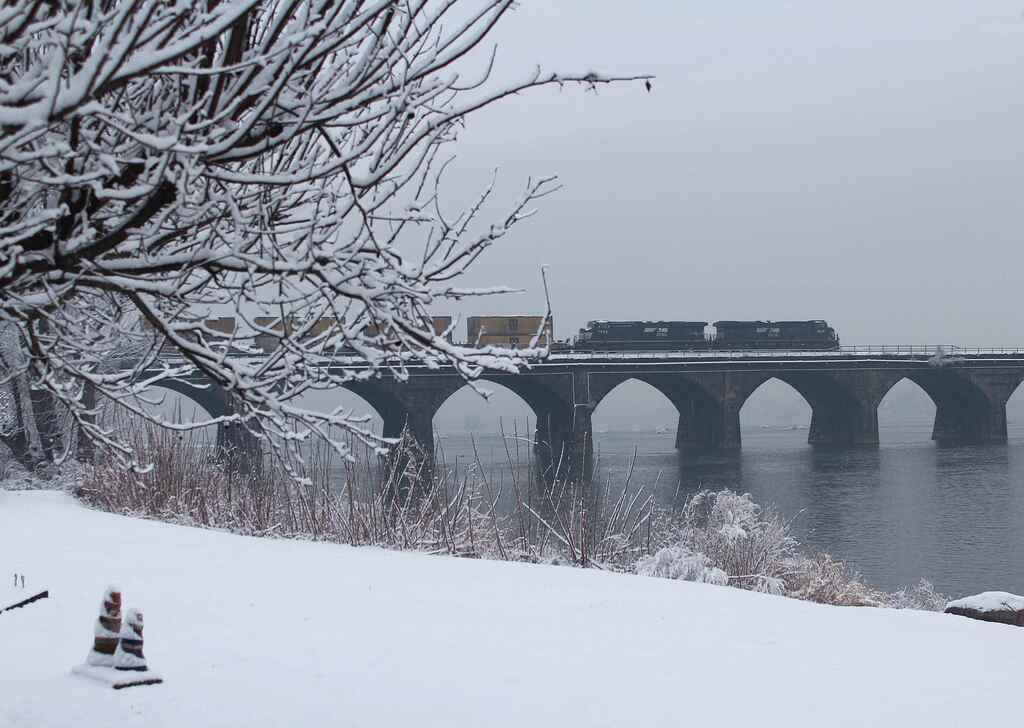 Winter has arrived early in Central Pennsylvania, it seems, as this NS intermodal rolls west acrosss Rockville Bridge. At The Bridgeview Bed & Breakfast. |