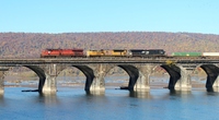 ![]() | COLORFUL BRIDGEVIEW!! Fall may be almost over, but we are still seeing a lot of colors at The Bridgeview!! The leaves are gone but the color remains as there have been plenty of colorful and varied locomotive lashups on trains in the Harrisburg PA area. Witness here, the NS 8114 leads a UP Flag unit, and an NS brother across Rockville Bridge on a westbound Intermodal train while passing right by The Bridgeview B&B! Lately, units from the Norfolk Southern Heritage fleet, BNSF, UP, CP, CN, CSX, KCS, and R. J. Corman have been plying the rails in and around The Bridgeview!! There are a lot more opportunities to see and photograph rail activity, since the leaves are off the trees. Also, don't forget you can observe and photograph trains passing over Historic Rockville Bridge from our sitting room or decks! There's no better lodging destination in the Harrisburg area or Central Pennsylvania to view and watch trains than The Bridgeview Bed & Breakfast located in Marysville PA. We have 10 clean, cozy rooms each with a private bath, and feature a tasty breakfast to start your day off right! Now is a great time to take advantage of our off season rates. Give us a call today at 717-957-2438 after visiting us online and checking all of the great guest comments on Trip Advisor, as well as pictures and daily updates on Facebook ! Come to The Bridgeview and see for yourself! |