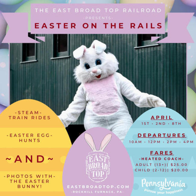 ![]() | East Broad Top ~ Easter On The Rails April 1st 2nd & 8th 2023 Create a new spring tradition and spend Easter on the rails at the historic East Broad Top Railroad. Ride a train, hunt for eggs, and meet the Easter Bunny! You’ll enjoy a scenic train ride through the heart of Huntingdon County, and every child will take home a special gift from the Easter Bunny! Arrive early or stay after your train ride for kids to participate in an egg hunt! What's Included? Scenic Train Ride Easter Egg Hunt Photos With the Easter Bunny! You won't want to miss this unique combination of an Easter & Railroad experience! Another related experience you won't want to miss, is The Bridgeview Bed & Breakfast, Central Pennsylvania's most popular railfan lodging destination. Watch as trains glide across Rockville Bridge on the Norfolk Southern mainline. But wait, there's more!! From the front porch, view trains as they roll in & out of Enola Yard! It's a train lover's paradise! Your stay includes a comfortable room with private bath, A/C, Wifi and a tasty breakfast. Visit our homepage for more information, and guest recommendations at Trip Advisor then call 717-957-2438 to book your stay. Come to the Bridgeview B&B and see for yourself why we are the lodging choice for folks visiting Central PA! |