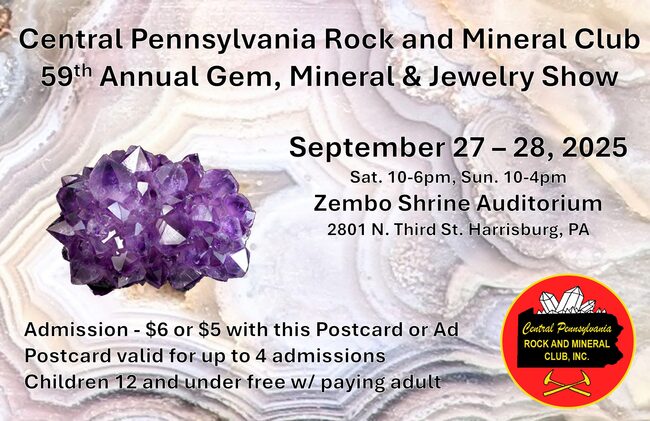 ![]() | Annual Gem Mineral & Jewelry Show September 27th & 28th, 2025 in Harrisburg Come on out to the Central Pennsylvania Rock and Mineral Club's Annual Gem, Mineral, and Jewelry Show, September 27th & 28th, 2025, at the Zembo Shrine Auditorium Harrisburg Consistory 2801 North Third Street in Harrisburg, PA, where you will find over 25 vendors to meet all your rock, gem, and jewelry needs. The event will feature, Pennsylvania Geological Survey display with free publications, informative programs presented by Jones Geological Services, a silent Auction and wheel of rocks, free prize drawings, educational mineral and fossil displays, kids can dig for rocks and gems for free in the kid's mini-mine, and more! When the show is over, come discover another type of gem, The Bridgeview Bed & Breakfast, where you can relax and enjoy the natural beauty of the Susquehanna River and Blue Mountains on display from our sitting room and decks. We are comfortably nestled in between the river and mountains in Marysville PA, right across the River from Harrisburg. Besides the spectacular view, we offer a private bath in each of our comfortable rooms, Wifi, and a tasty breakfast to start your day! Check our website and guest referrals at Trip Advisor . Make the Bridgeview B&B your lodging choice for events in the Harrisburg area of Central Pennsylvania by calling 717-957-2438, or email bridgeviewbnb@yahoo.com. Come see for yourself why our guests keep coming back! |